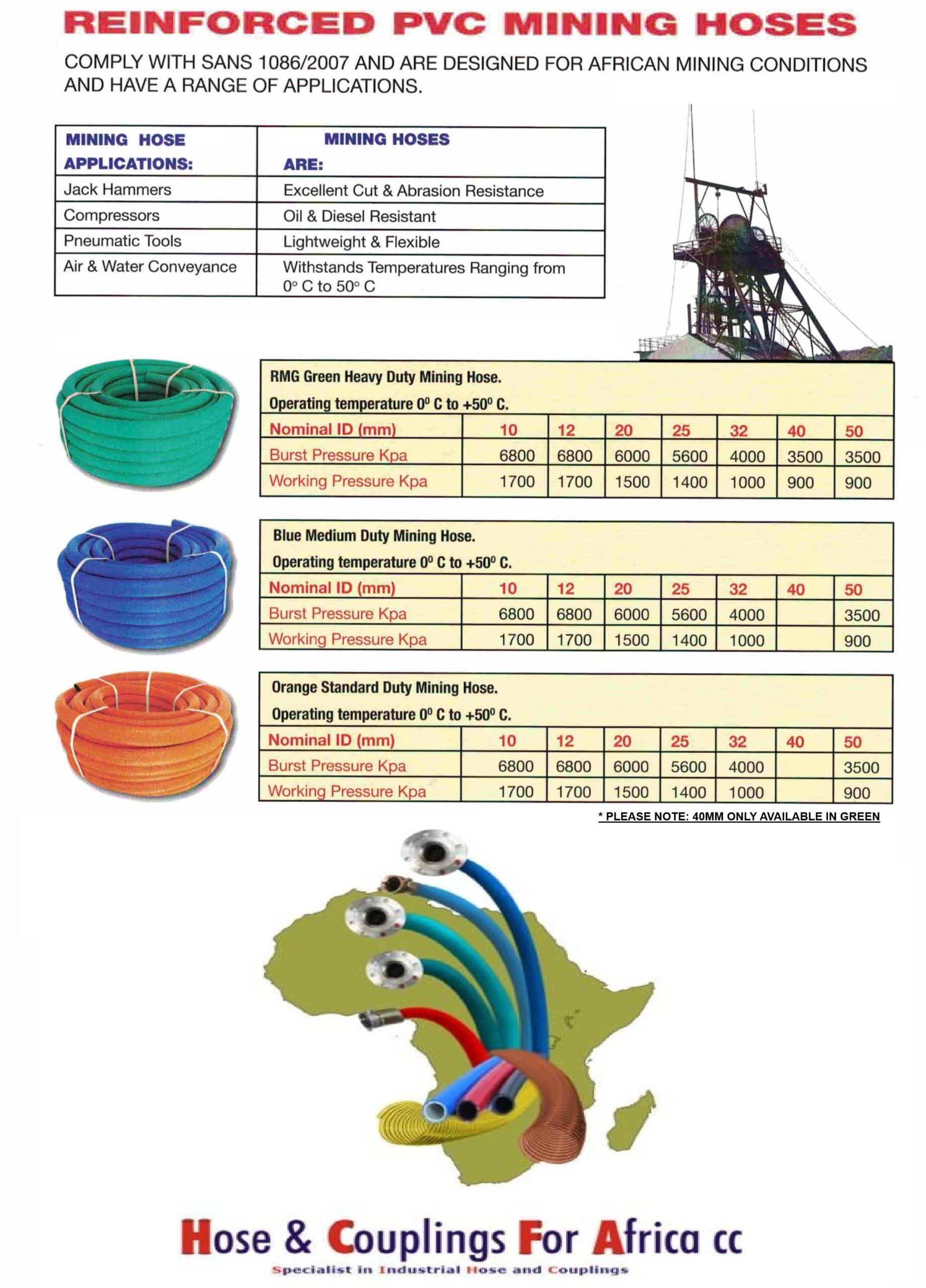 HOSE AND COUPLINGS’ PVC industrial hoses have proven to be exceptionally efficient in low to medium pressure air and water functions. Our PVC industrial hose are available in a wide range of products. Product ranges include Mining Hose(SANS 1086),air and water hoses(reinforced and non-reinforced), water suction hose, hose for agricultural use such as dragline, crop spray hose, heavy duty garden hose, PVC lay flat hose, included are food grade nontoxic and light flexible PVC ducting hose.